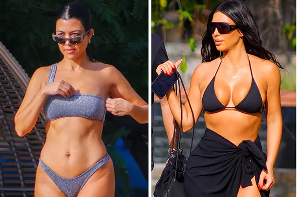 Kim Kardashian West and Kourtney Kardashian flaunt their figures on a family holiday –a reward for their strict diets and fitness routines.