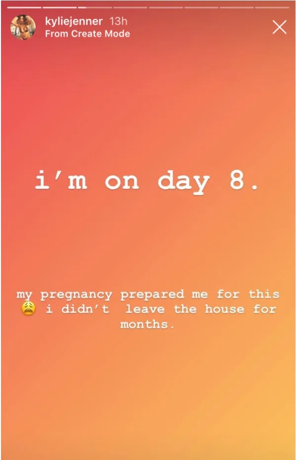 “Another daily reminder to take this social distancing seriously and self-quarantine,” Jenner shared with her 166 million followers on Instagram Stories. In a follow-up to her story, she added, “I’m on day 8. My pregnancy prepared me for this. 😩 I didn’t leave the house for months.”