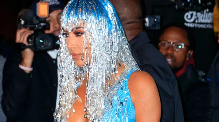 The eldest Kardashian wore a latex blue mini dress with matching boots and a silver fringed wig.