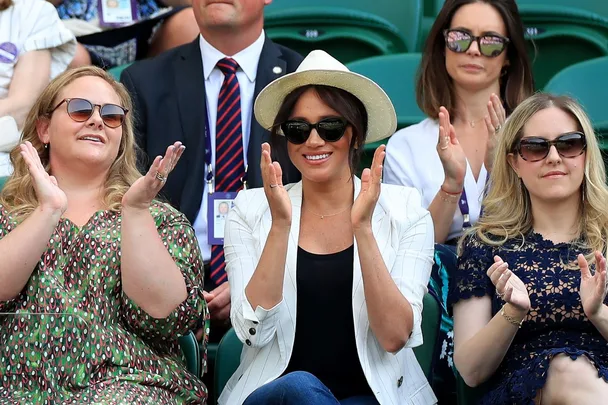 The stylish Duchess of Sussex was spotted on Court One cheering on long-time friend Serena Williams, as the tennis champ took on Kaja Juvan at day four of the London tennis competition.