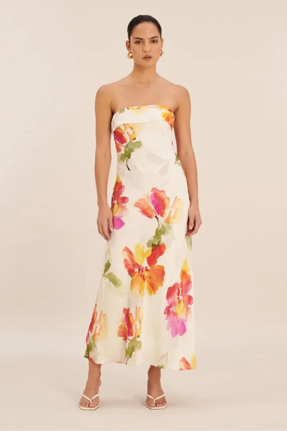 AERE Satin Bias Cut Strapless Dress in Ainsley Print